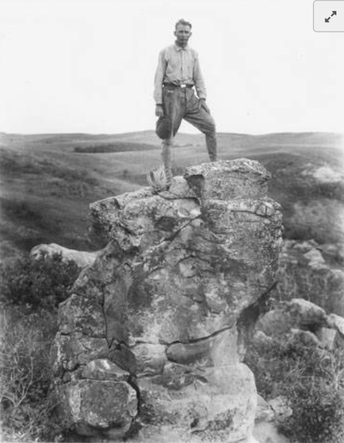 | Clell Gannon atop a rock formation near Grassy Butte, North Dakota. Photo by Russell Reid, 1923. [Source: State Historical Society of North Dakota] |